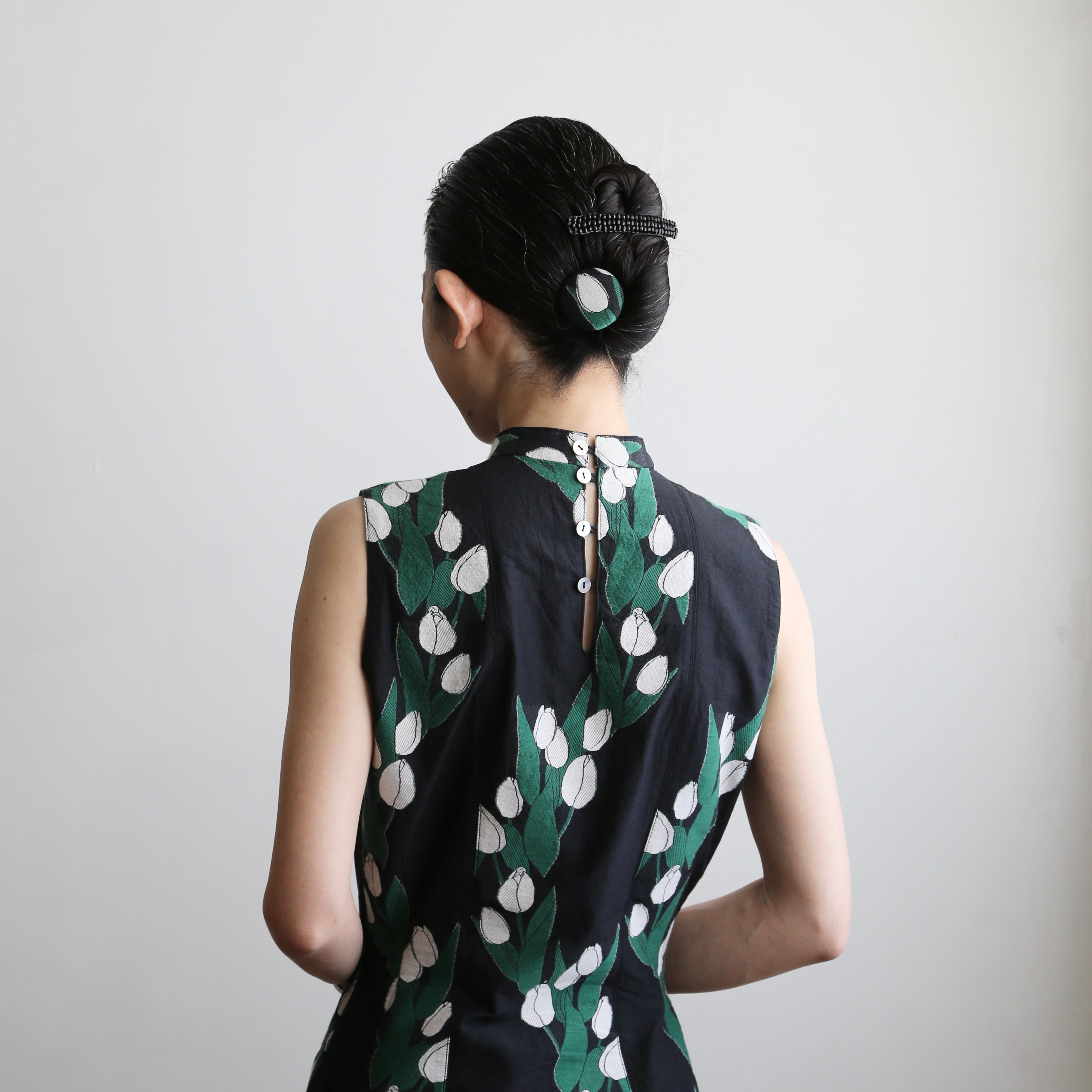 大きく波打つように連なるチューリップを糸で描きました。柄の中に異なる織物組織を配置して経緯の糸の交わり方を変えることで、色の濃淡を生み、奥行きのある表現にしています。